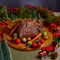 Roasted Beef Ribeye with Home Seasoning and Mustard, accompanied by Roasted Root Vegetables and Potatoes, served with Gravy and Mustard.